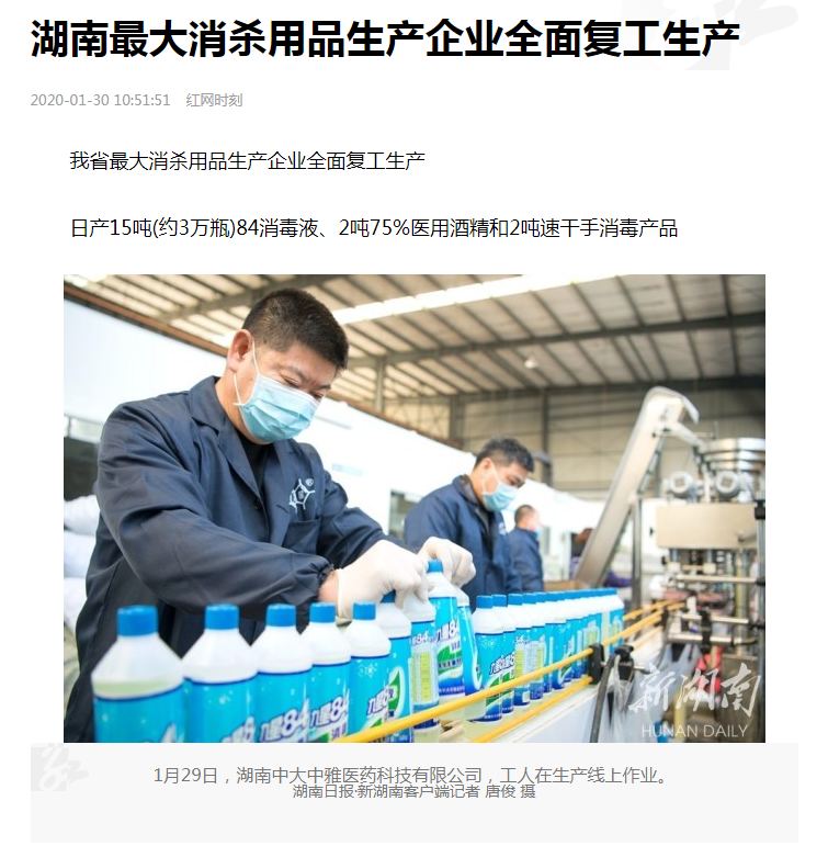 湖南威盛塑料制品有限公司是我司湖南省客戶(hù)之一,主要經(jīng)營(yíng)聚酯塑料瓶及瓶坯生產(chǎn)、銷(xiāo)售。應(yīng)湖南省工信廳協(xié)調(diào),為中大中雅醫(yī)藥科技有限公司供應(yīng)消毒液瓶和酒精瓶等。中大中雅被湖南被省新型冠狀病毒感染的肺炎疫情防控工作領(lǐng)導(dǎo)小組防疫物資保障組列為疫情防控期間省重點(diǎn)聯(lián)系企業(yè),是湖南省最大消殺用品生產(chǎn)企業(yè),全面復(fù)工24小時(shí)不間斷生產(chǎn)后,實(shí)現(xiàn)日產(chǎn)“九星”牌84消毒液15噸(約3萬(wàn)瓶)、75%醫(yī)用酒精2噸和速干手消毒產(chǎn)品2噸,有力保障湖南省新型冠狀病毒感染肺炎防疫工作。